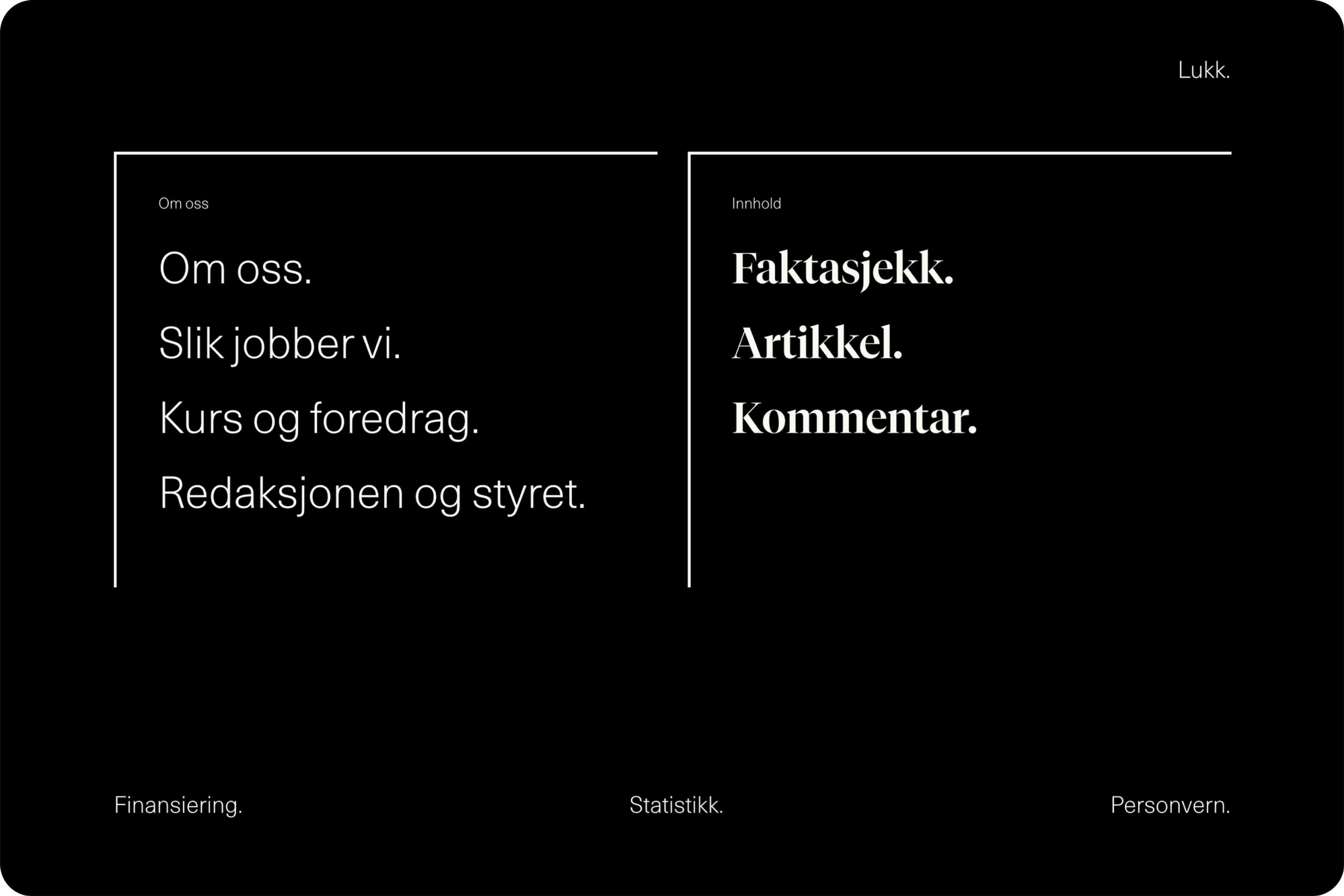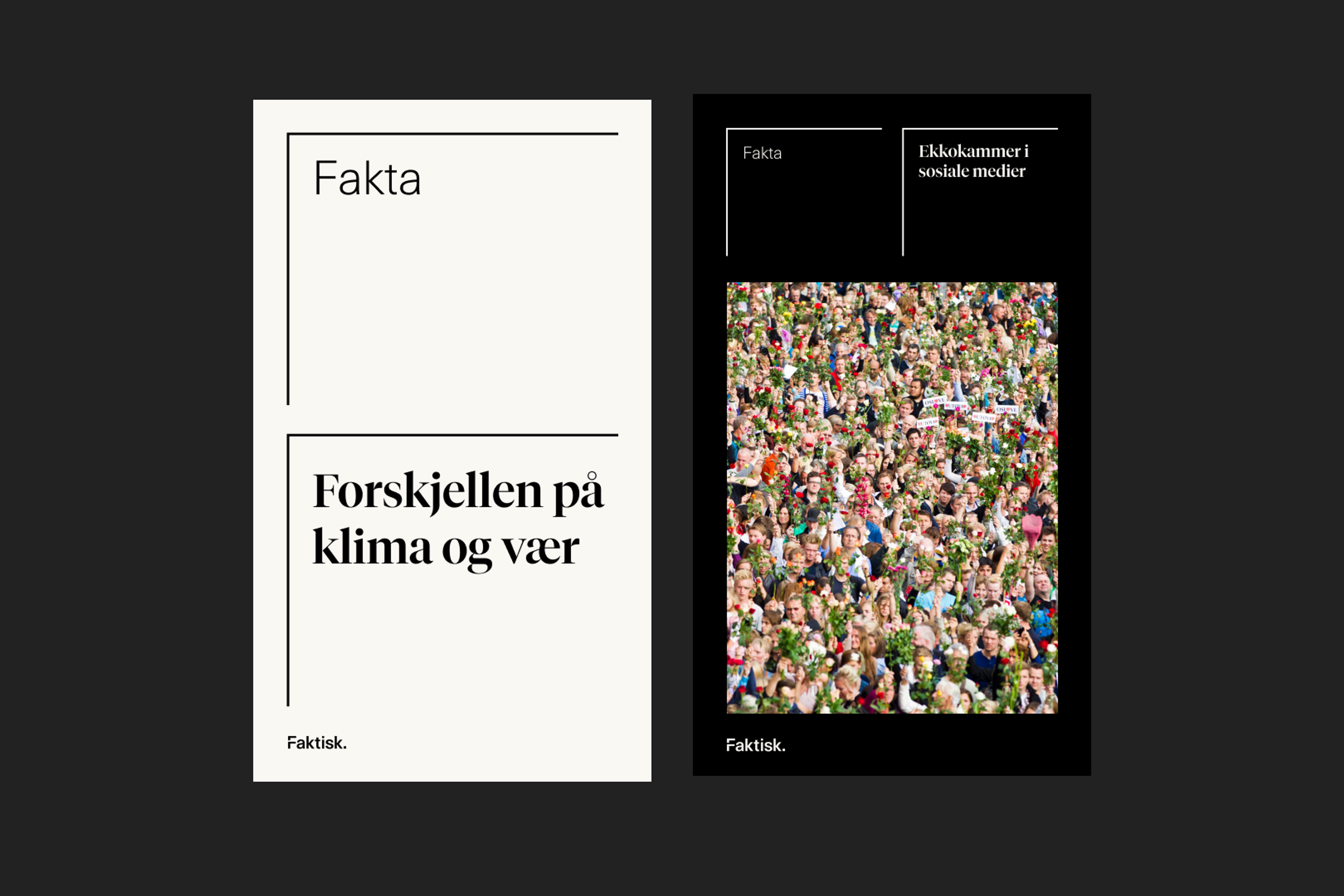 Sort og hvitt var et naturlig valg for en organisasjon som jobber med faktasjekking. Det spiller også videre på konseptet med to sider av en sak.